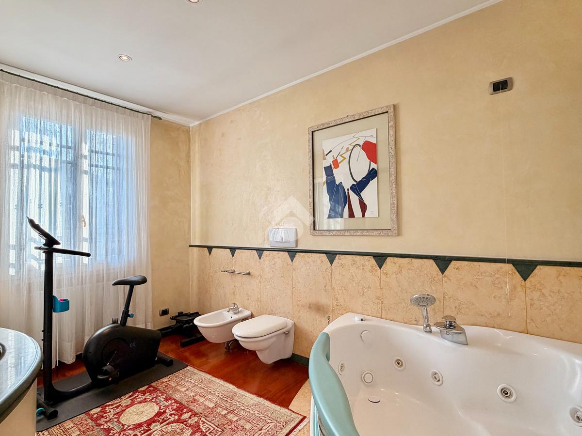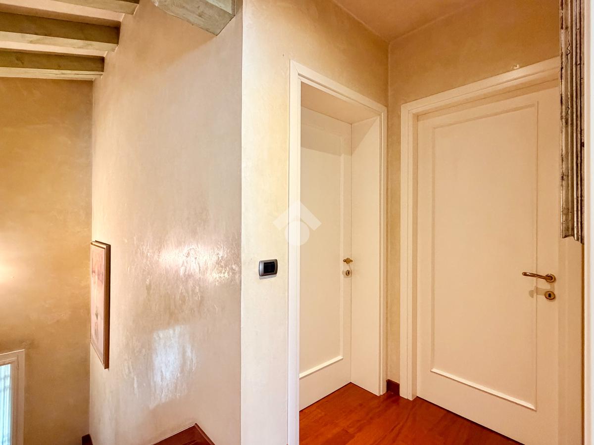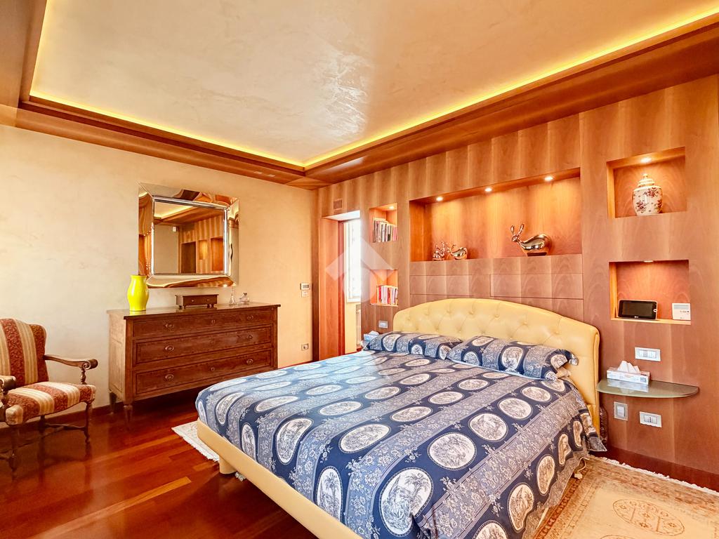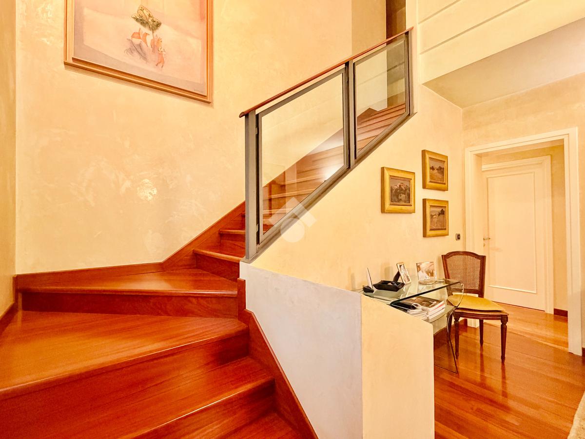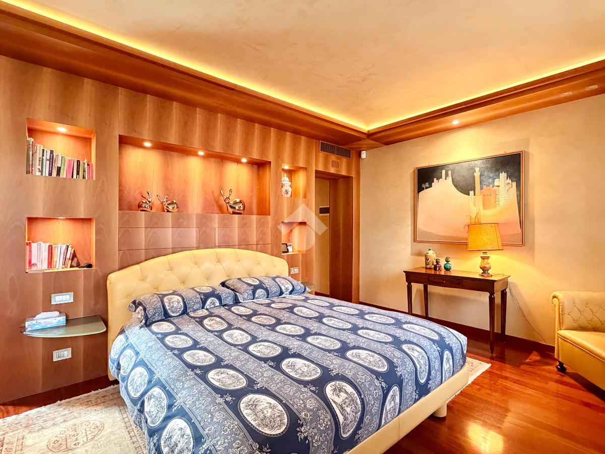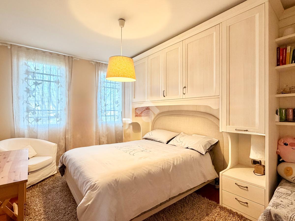 Il piano primo ospita la zona notte, composta da una confortevole camera matrimoniale e una singola dagli spazi molto generosi, servite da un ampio bagno finestrato dotato di vasca idromassaggio. La suite padronale, rivesta con una preziosa boiserie in legno di ciliegio, rappresenta un autentico rifugio di benessere, completa di cabina armadio e bagno privato, pensata per offrire il massimo del comfort e della riservatezza.